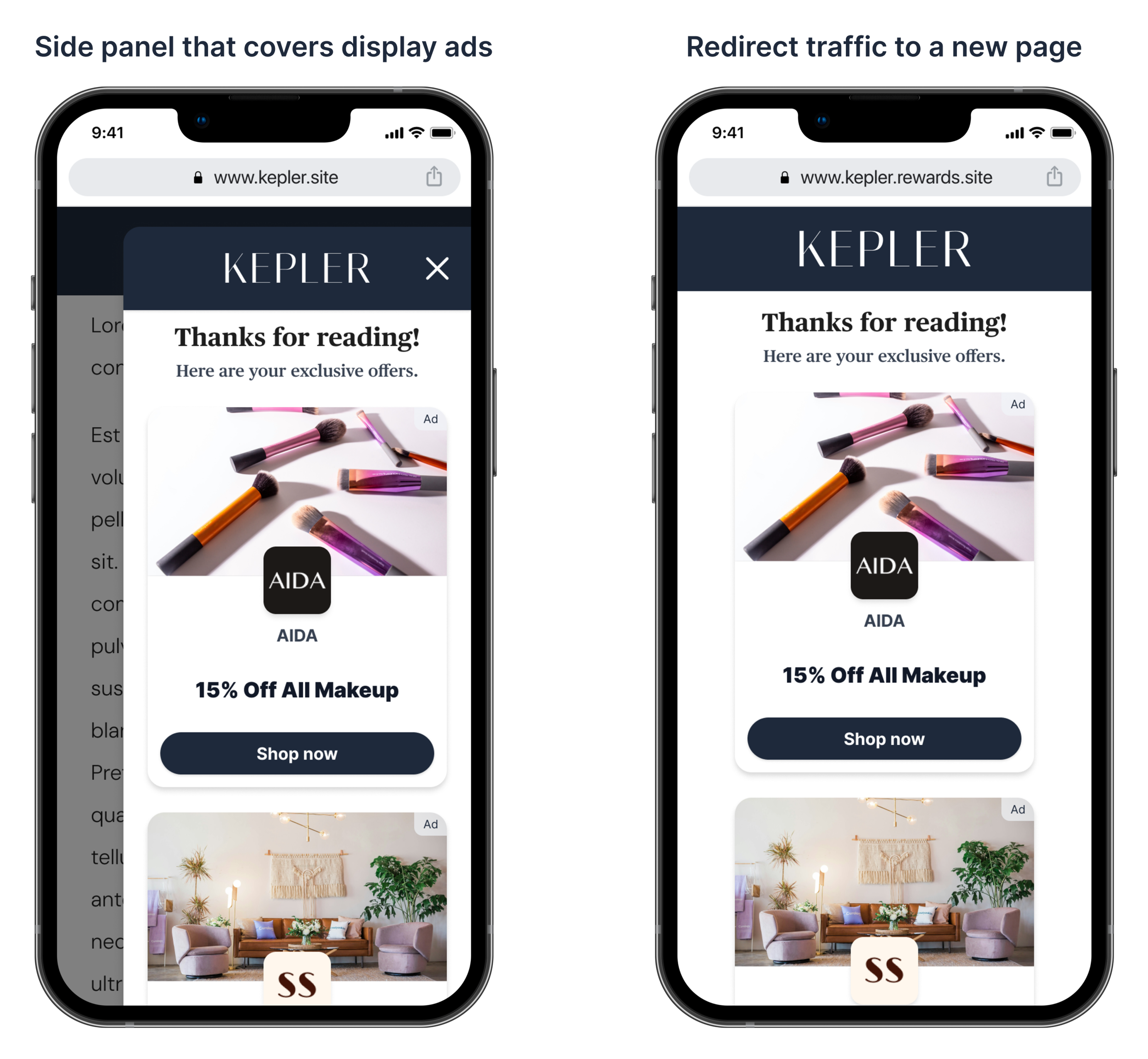While our publisher clients were pleased with our engagement rates and wanted to continue to partner with us, some didn’t like that our solution either redirected their traffic to a new page (which didn’t qualify as a conversion), or opened a side panel that sometimes covered their current display ads, impeding on impression-based revenue.